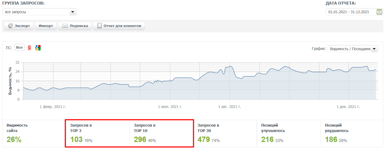 Дальше мы проводили все плановые работы и за 21 год сайт совершил очередной скачек по позициям в ТОП-3 вышло 103 запроса, в ТОП-10 уже наблюдалось 296 ключевых фраз.