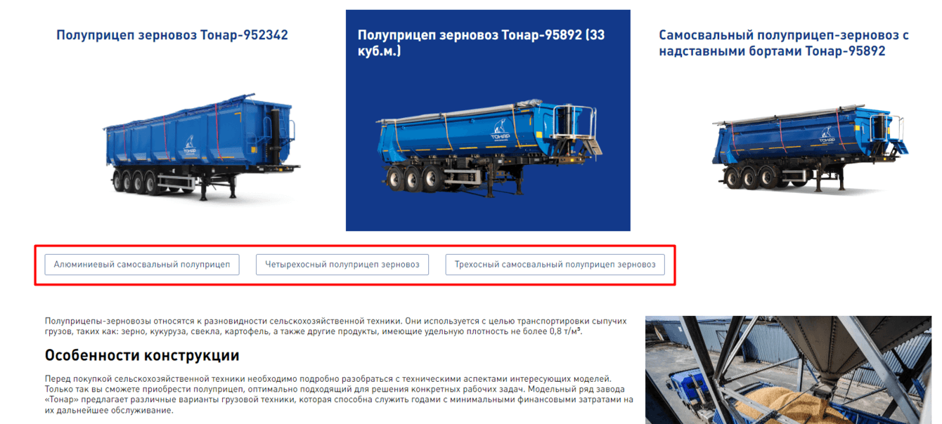 В рамках работ по продвижению сайта, сделали правильную структуру сайта - под каждый вид полуприцепов был сделан свой раздел, который в свою очередь содержит подразделы по типам. На страницы всех разделов были написаны seo-тексты и в них внедрена перелинковка. Были досконально проработаны карточки товара, под требования поисковых систем: каждая карточка содержит несколько фотографий продукции, её видеообзор, есть подробное описание и технические характеристики каждого полуприцепа, внедрена форма обратной связи и контакты менеджера, который может проконсультировать именно по данной модели.