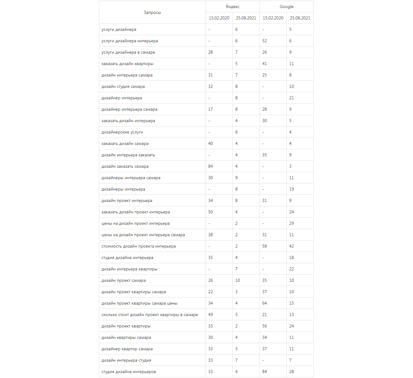 По позициям проекта по целевым запросам в поисковых системах Яндекс и Google виден заметный рост. Тематика «дизайн интерьера» считается очень сложной для продвижения из-за высокой конкуренции и полуинформационности некоторых запросов.