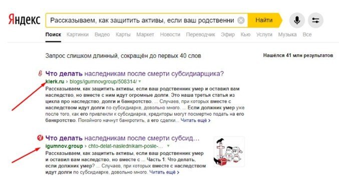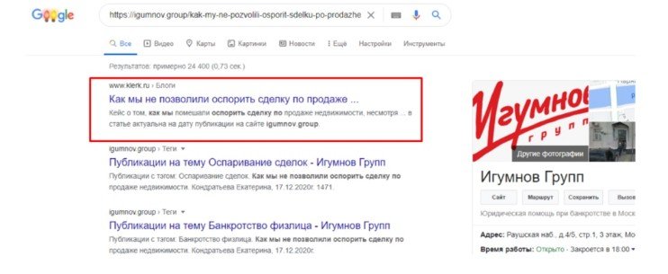 Эту гипотезу подтвердил простой эксперимент: мы сняли с публикации несколько статей на klerk.ru и через некоторое время Google снова вывел оригинальные материалы igumnov.group в поиск.
