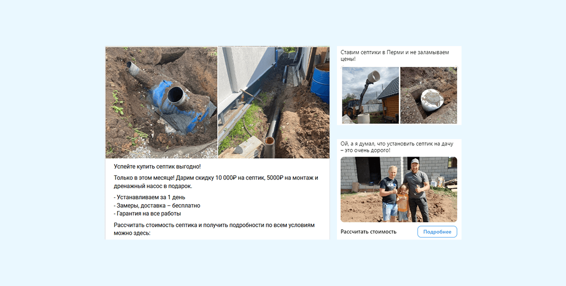 Показывать красивые дизайнерские фото для продвижения септиков нецелесообразно. Наилучший отклик даёт визуал, снятый во время реального монтажа септика — фото и видео, сделанные на обычный смартфон.