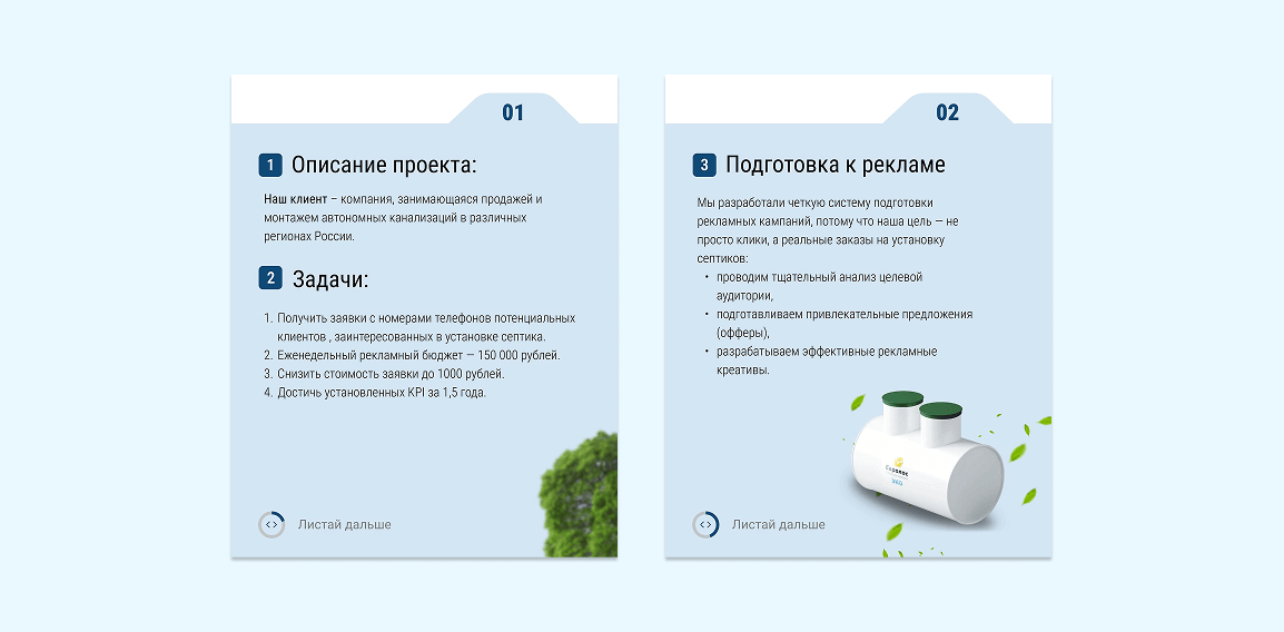 Мы создали отлаженную систему подготовки рекламных кампаний, ведь наша задача — не просто увеличение кликов, а получение реальных заявок на установку септиков. Перед запуском каждой кампании мы: