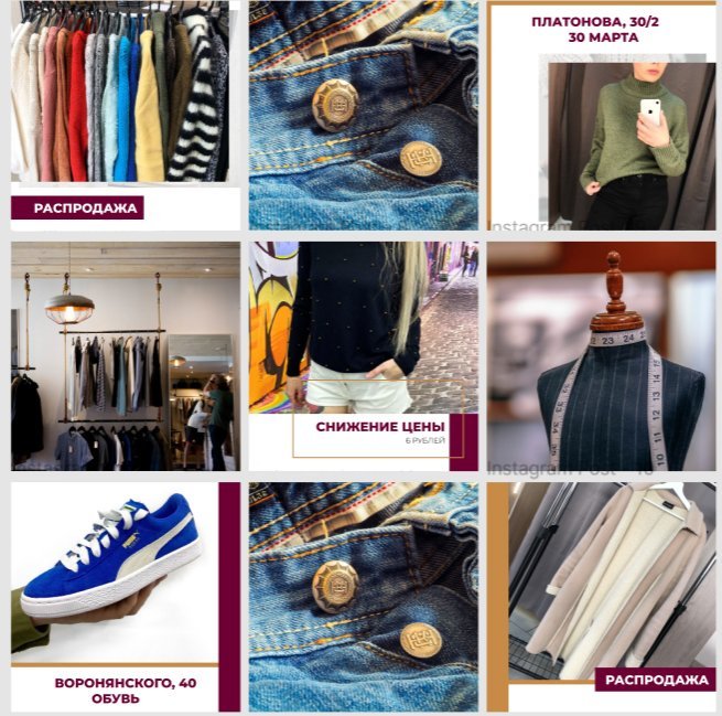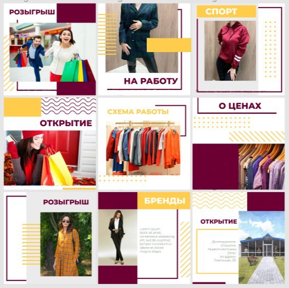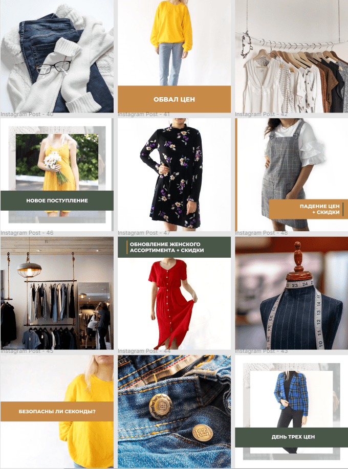 Мы предложили клиенту оформление обложек для актуальных историй, а также две концепции шаблонов для постов: выдержанный с акцентом на фотографии и динамичный с графическими элементами, подчеркивающими разнообразие товаров в магазине.