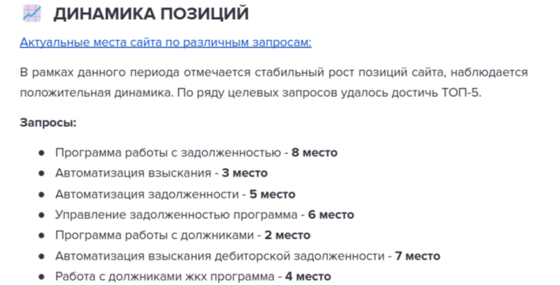 - Увеличение видимости: За шесть месяцев работы сайт вышел в ТОП-5 и ТОП-10 по ряду высокочастотных запросов, что является значительным достижением для данной ниши.