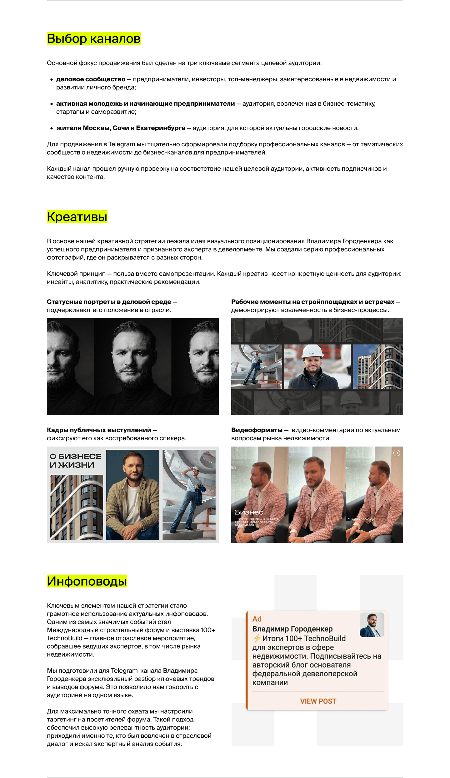 Продвижение личного бренда требовало гибкости — мы не только придерживались общей стратегии, но и оперативно реагировали на инфоповоды, интегрируя ситуационный контент в продвижение через VK Рекламу и Telegram Ads.