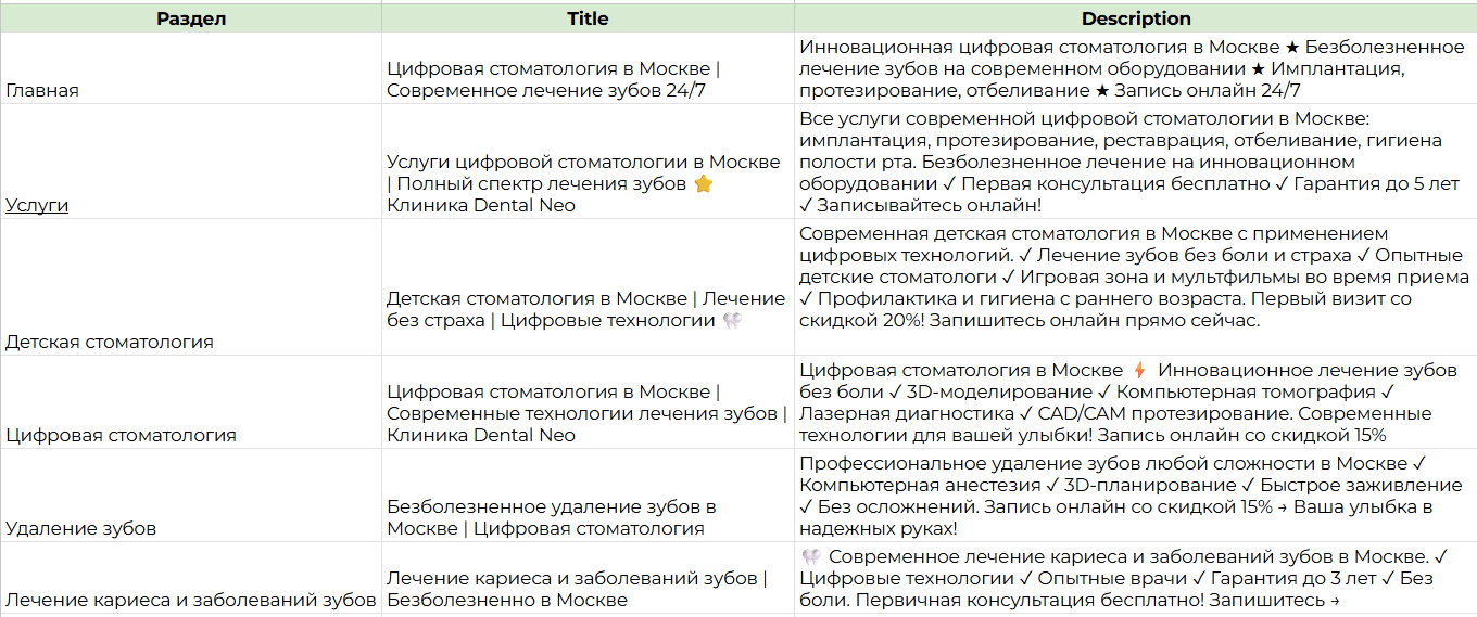 Провести базовую SEO-оптимизацию сайта, чтобы повысить его видимость в поисковых системах и, в конечном итоге, привлечь больше заявок на стоматологические услуги