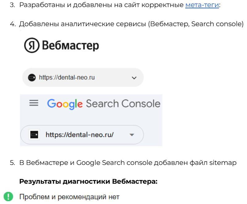- Настроены инструменты аналитики и мониторинга (Google Analytics, Яндекс.Метрика) для отслеживания посещаемости и эффективности внедренных изменений.