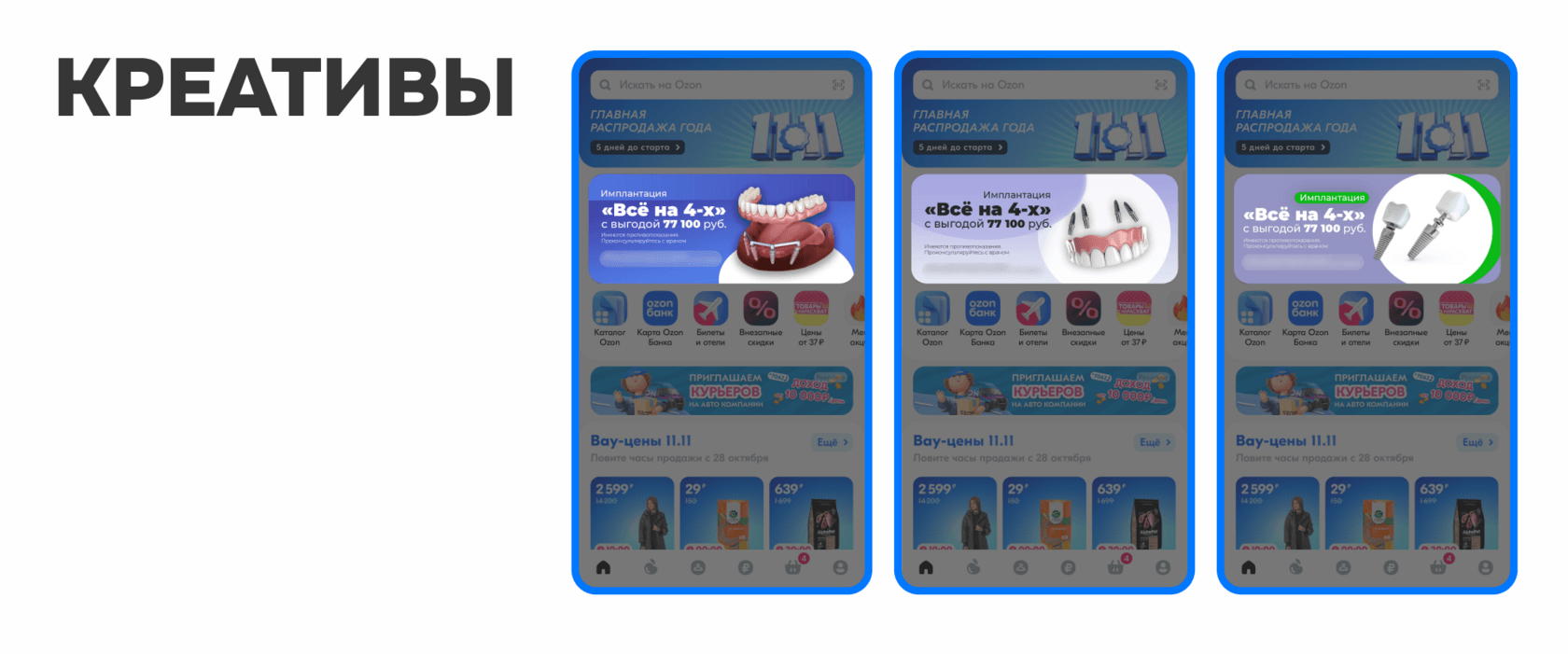У клиента было ещё 2 посадки для сбора заявок на имплантацию. Эксперты Церебро согласовали эти посадки с Ozon и подготовили креативы под новые офферы.