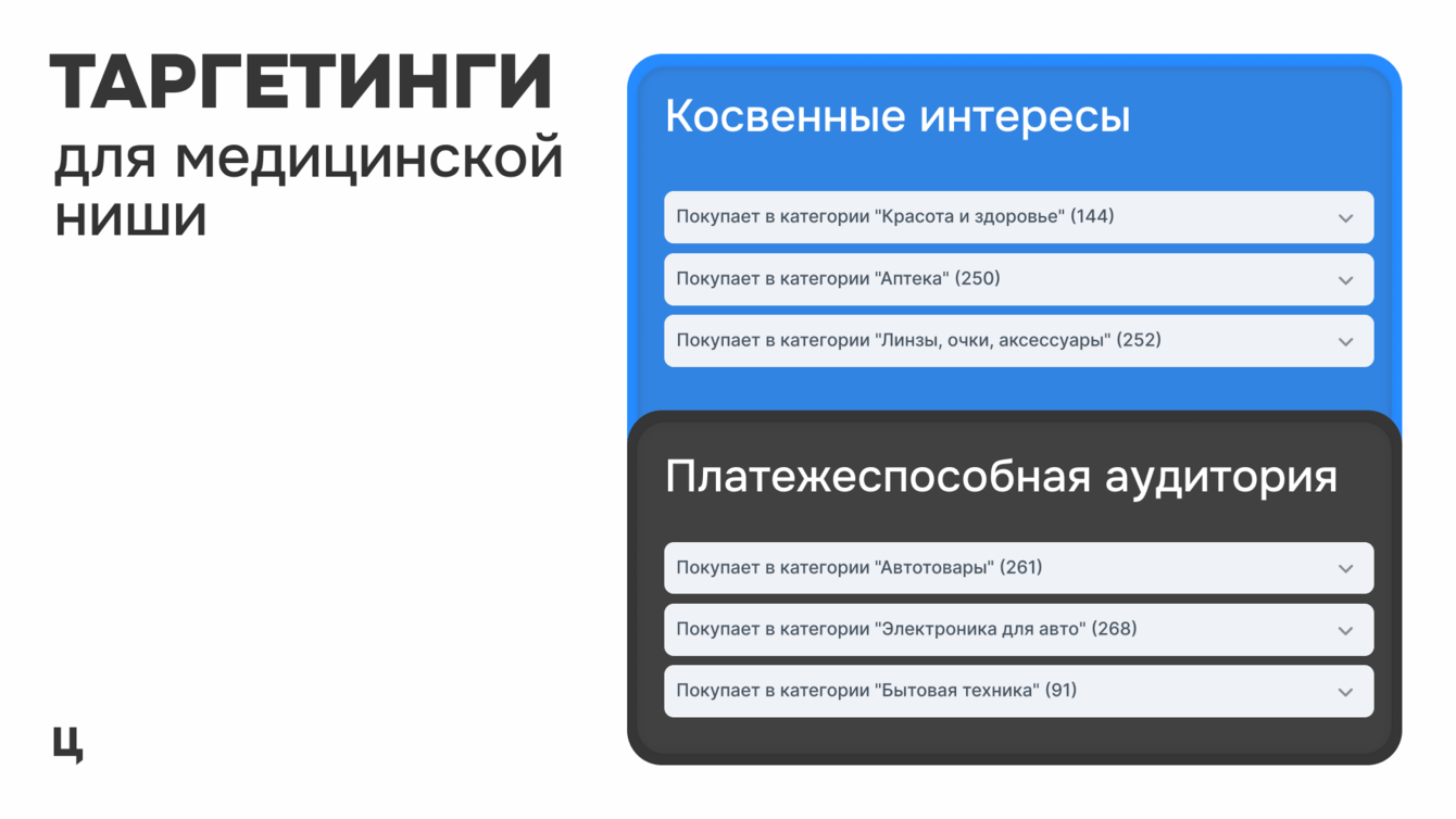 Например, потенциальные клиенты медицинской клиники — это люди, которые следят за своим здоровьем и внешним видом. Покупки на Ozon в категории «Красота и здоровье» (витамины, лекарства, уходовые средства) могут косвенно указывать и на потребность в медицинских услугах.