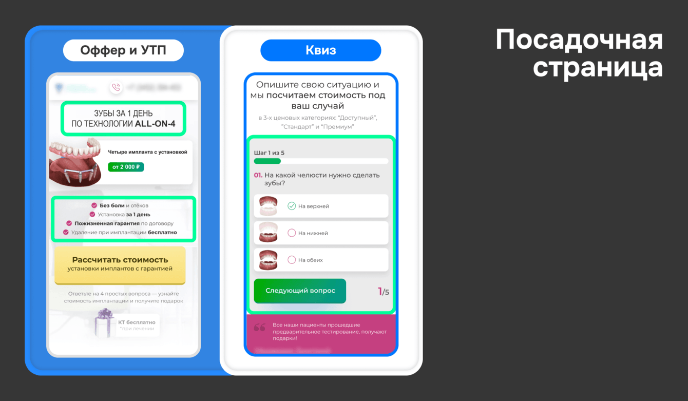 1. Приоритетной для клиента услугой является имплантация, поэтому посадки и оффер заказчик сформировал под неё.
