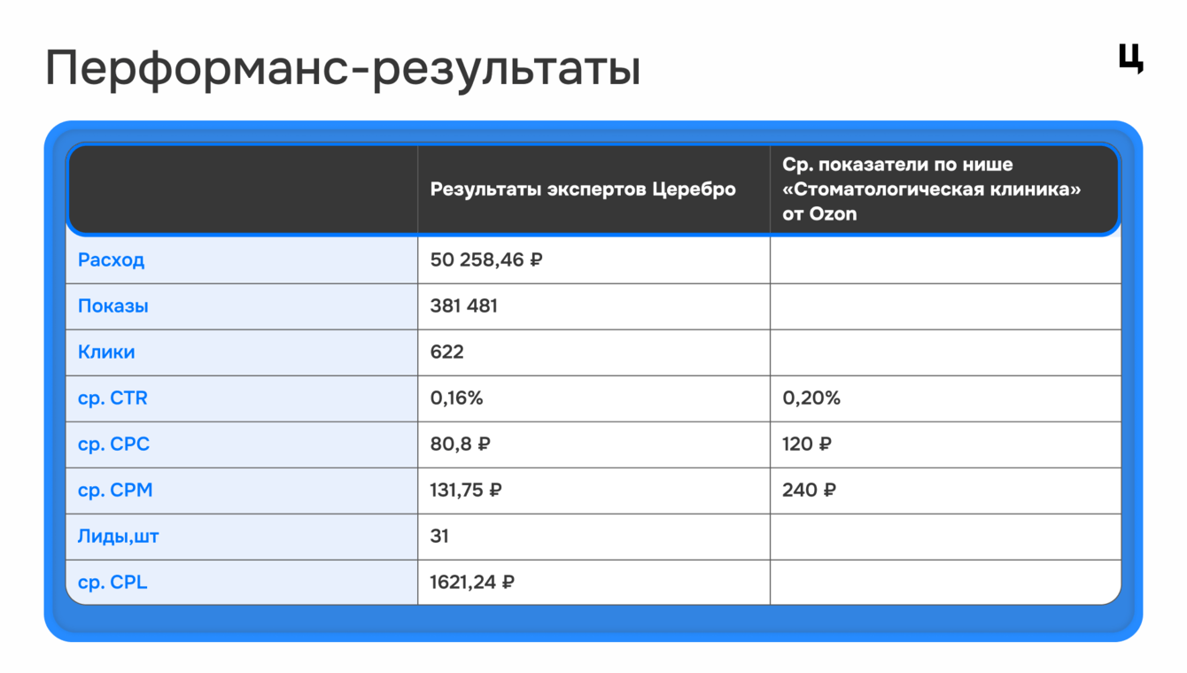 В результате теста экспертам Церебро удалось получить результаты сопоставимые с усреднёнными показателями среди всех рекламодателей Ozon в нише «Стоматологии»