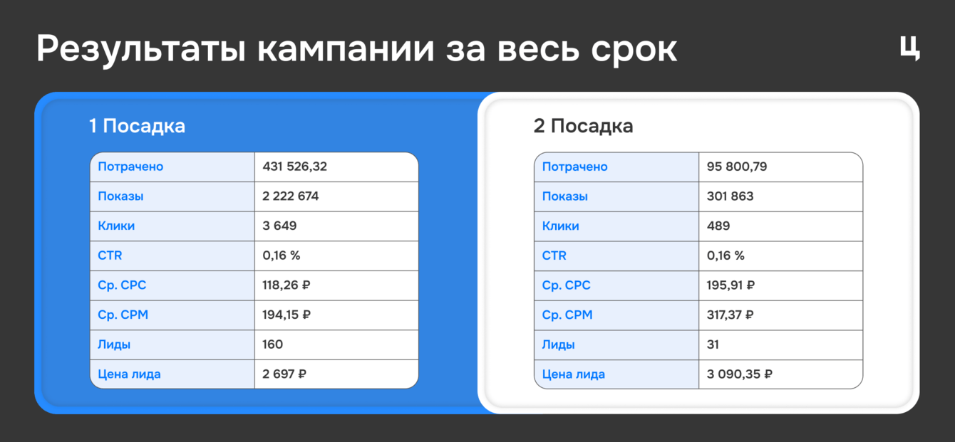 Тест первой посадки не принёс ни одного лида, поэтому от работы с ней отказались.