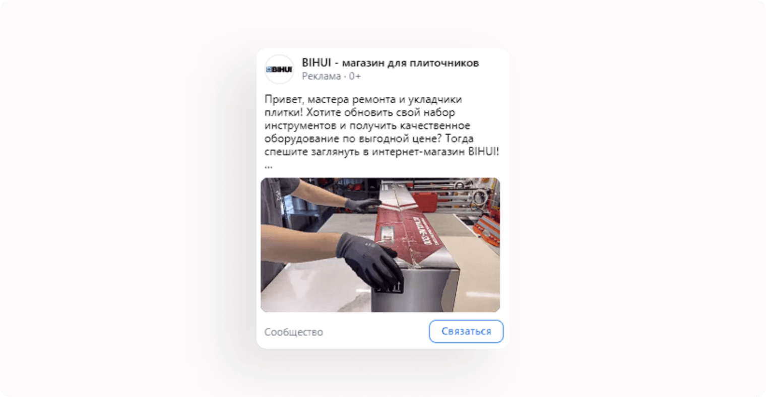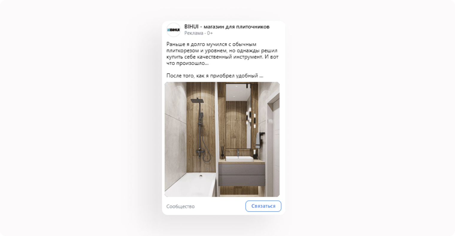 1. Опросив строителей и дизайнеров, выбрали изображение, которое вызывает интерес у специалистов. Оно на первый взгляд может показаться не примечательным, однако опытный глаз заметит сложность и красоту такой работы. Дополнили изображение сторителлингом про то, как мастер раньше мучался и выполнял объекты несколько месяцев, но потом приобрел качественный плиткорез и теперь скорость выполнения выросла в разы.