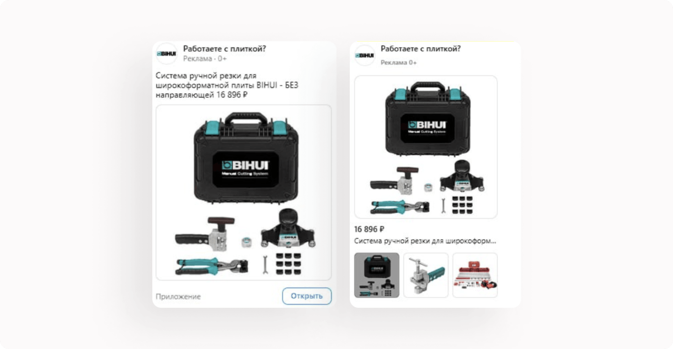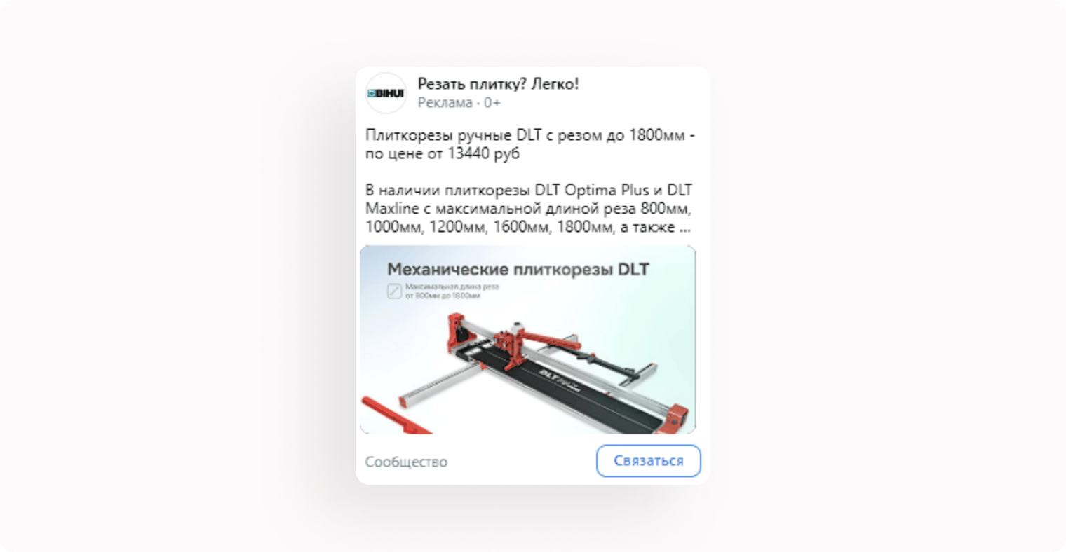 2. Для качественного продвижения нужно вникнуть в ассортимент и понять ключевые преимущества того или иного товара. Сделав это совместно с заказчиком, были созданы креативы с определенными моделями плиткорезов, которые интересны покупателям соотношением функциональности и стоимости: