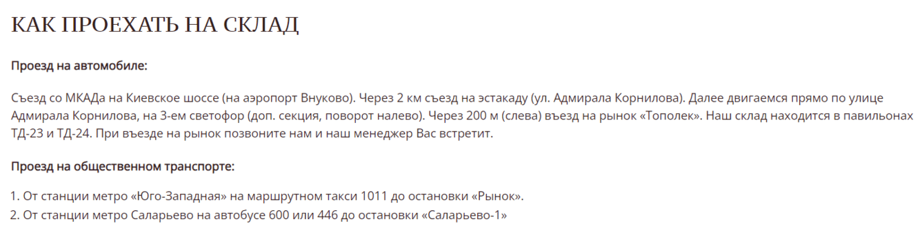 5. Добавили информацию о маршрутах до склада как на личном авто, так и на общественном транспорте: