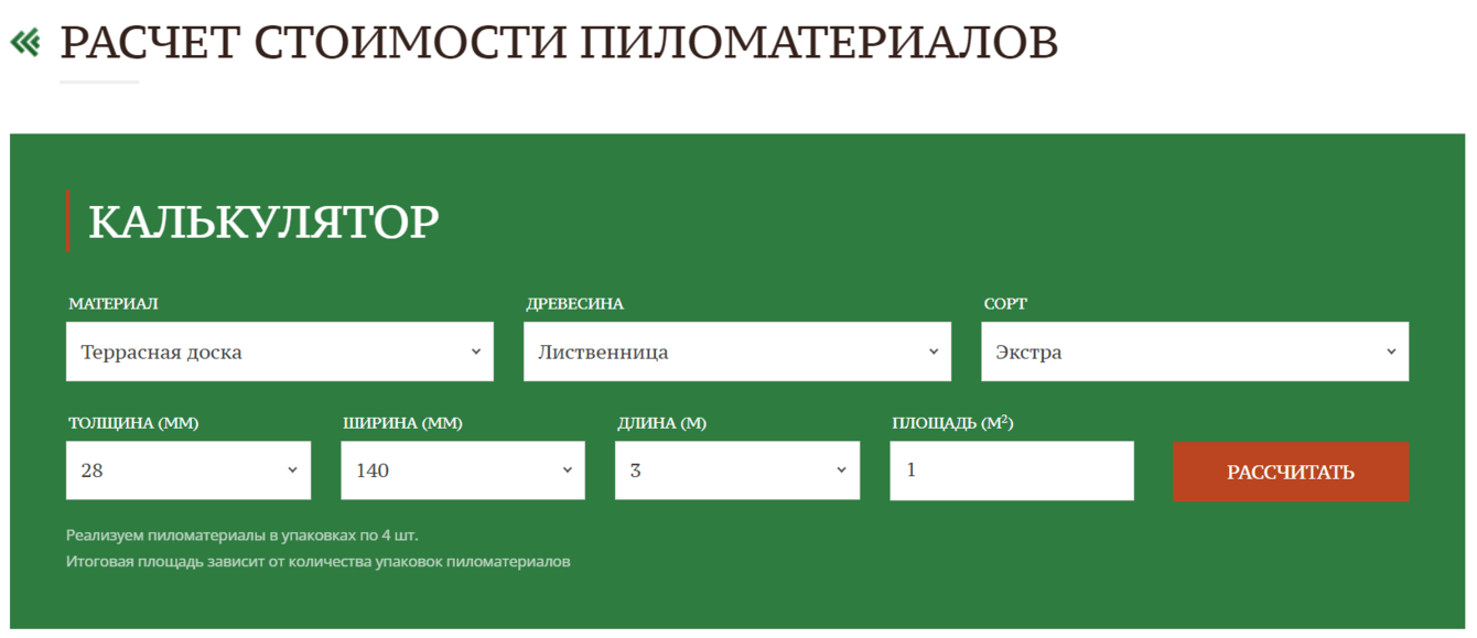 4. Разработали и разместили на сайте калькулятор расчета стоимости всех видов и сортов древесины:
