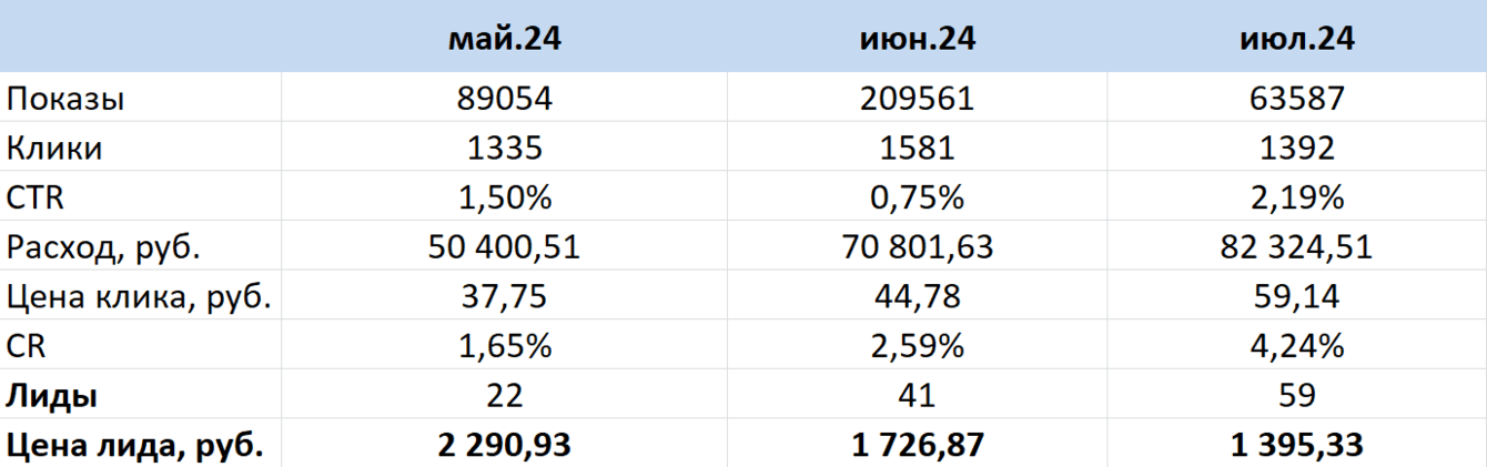 Изначально клиент дал понять, что рекламный бюджет будет зависеть от эффективности рекламы, так как прошлый подрядчик не смог оправдать ожидания клиента.