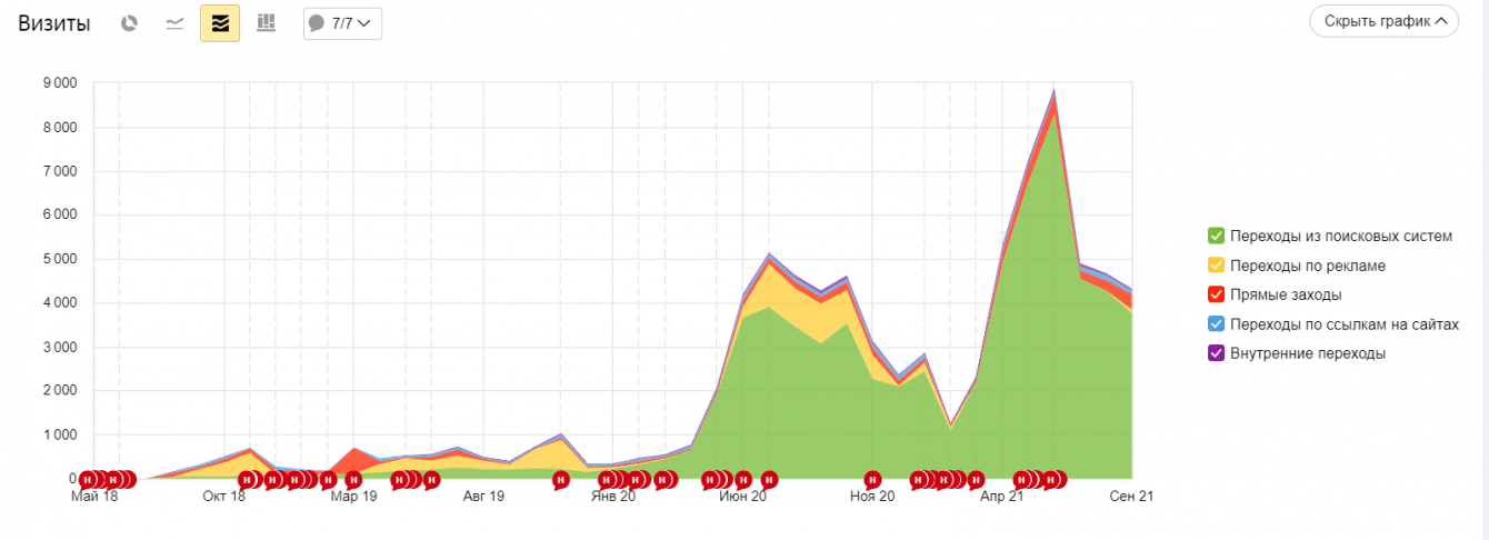 Органический поиск и хорошая видимость сайта давали нам весь необходимый трафик, поэтому в 2021 году было решено отказаться от платной рекламы. Несмотря на это, 2021 год стал рекордным по объему продаж и посещаемости.