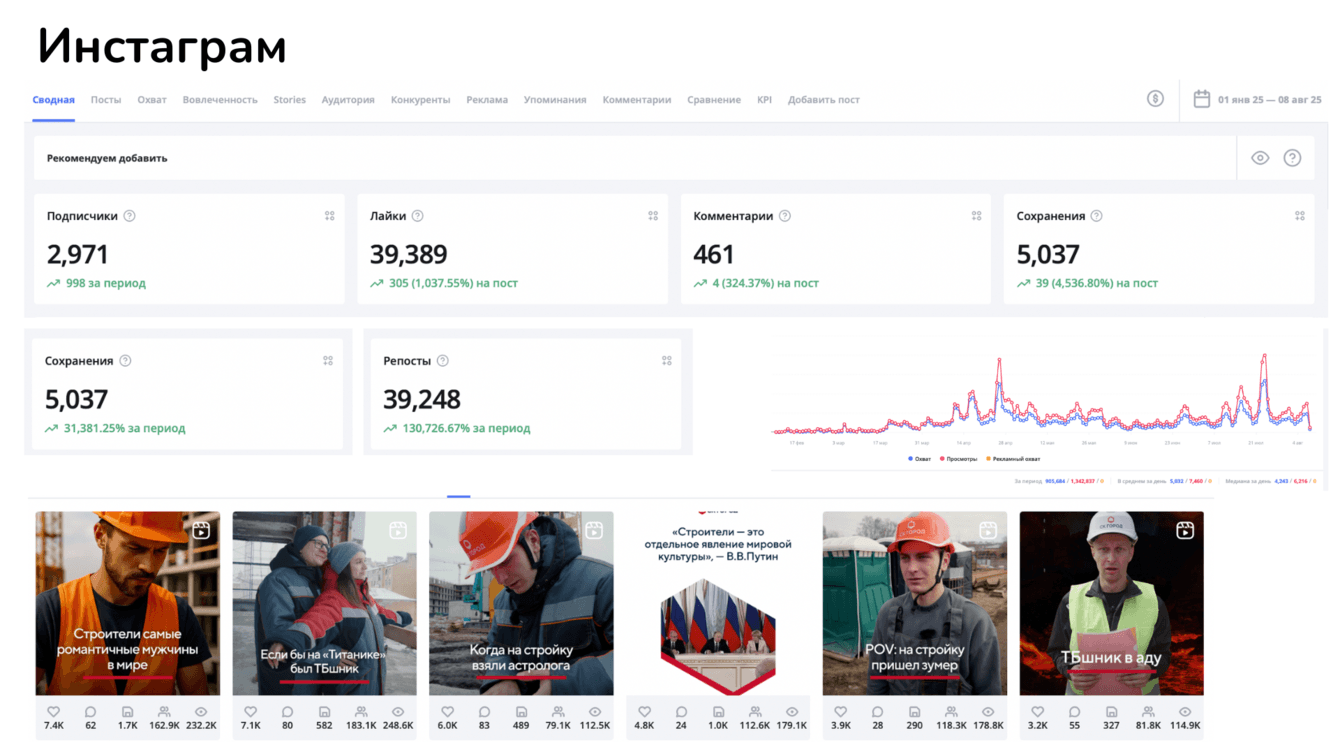 Контент стал виральным. Reach Rate в Instagram на уровне 252% и 38 971 репост доказывают, что контент активно распространялся за пределы аудитории, решая задачу повышения узнаваемости. Аудитория контента: мужчины, 27-45 лет, интересы: стройка), гео Москва и Питер.