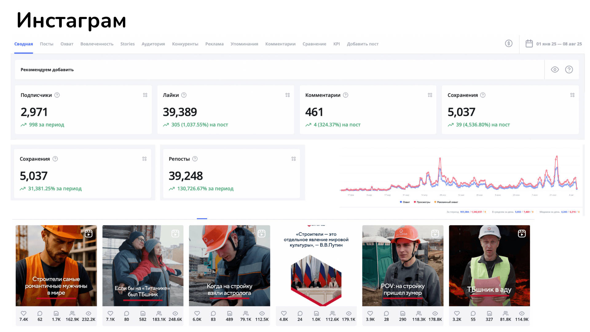 Контент стал виральным. Reach Rate в Instagram на уровне 252% и 38 971 репост доказывают, что контент активно распространялся за пределы аудитории, решая задачу повышения узнаваемости. Аудитория контента: мужчины, 27-45 лет, интересы: стройка), гео Москва и Питер.