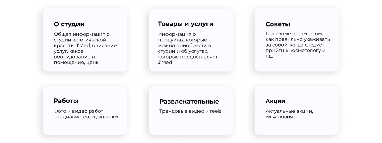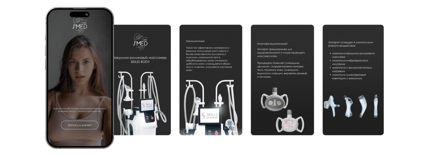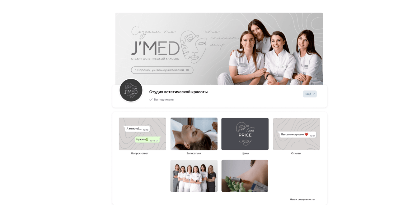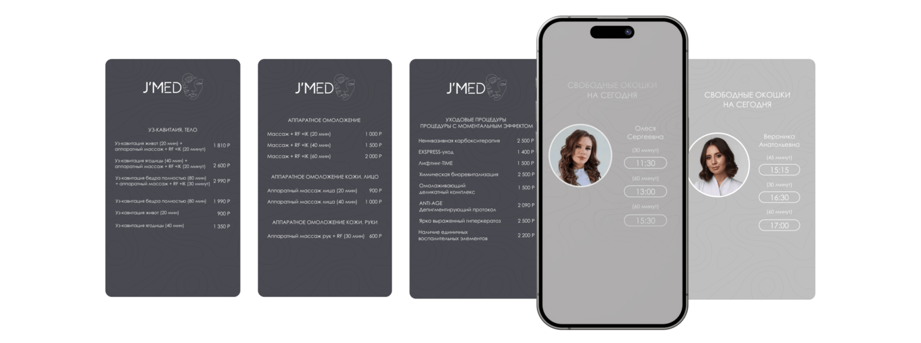 - Повысить узнаваемость: сделать J’Med известной студией в городе, закрепить образ современной и профессиональной клиники, специализирующейся на эстетической красоте.