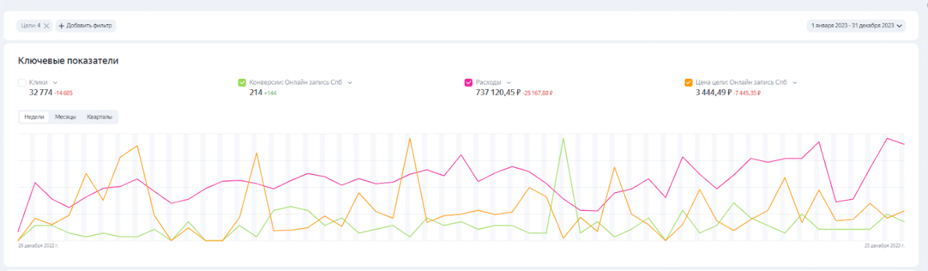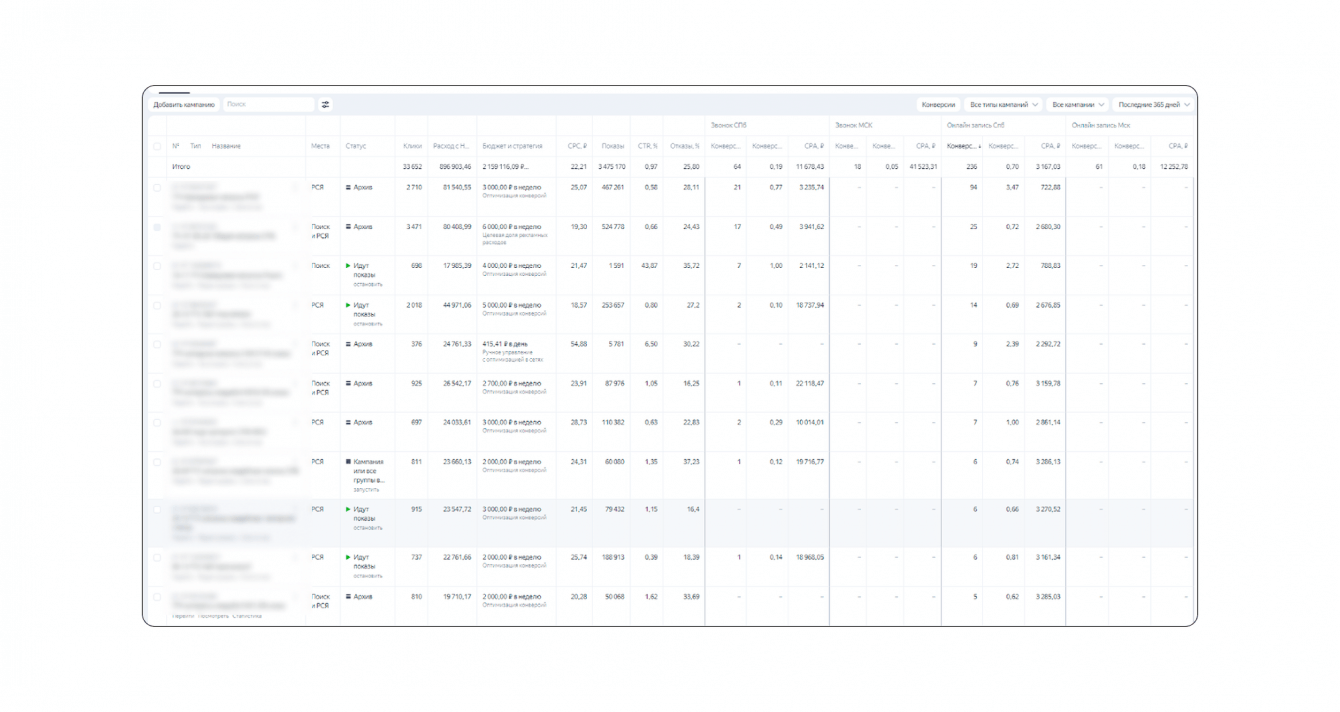 Рекламный кабинет на два сайта и счетчика. Срез по цене и количеству конверсий не совсем корректный, но на скрине виден бюджет, потраченный в течение года, и общая статистика по РК.