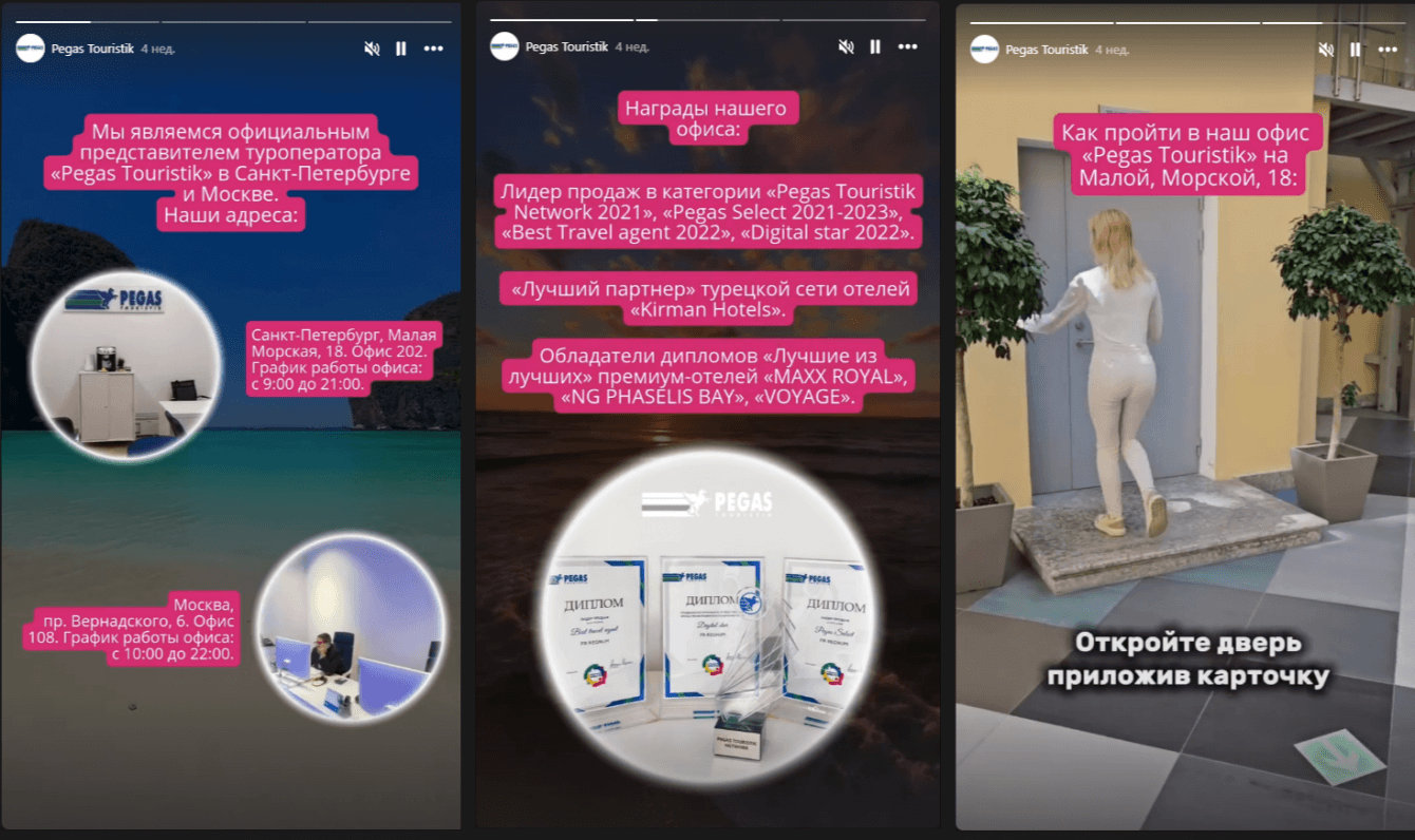 В описании аккаунта было важно подчеркнуть достоинства компании и сразу перевести пользователя в Telegram, где осуществляется продажа туров. В актуальных историях размещены информация о турагентствах компании и их награды, чтобы пользователи понимали, что оформить тур можно как дистанционно, так и в любом из офисов.