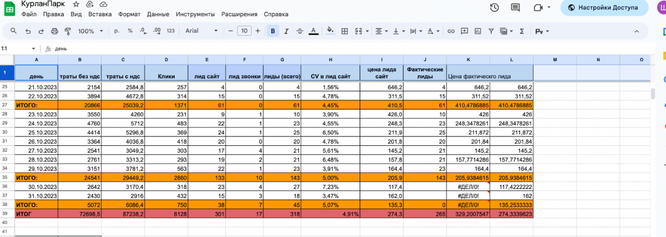 Как вы видите на снимке выше, лучше всего сработали заявки через мессенджеры. По обратной связи от клиента мы заполняем таблицу и смотрим реальную картину по лидам, для этого у нас в таблице есть столбик «цена фактических заявок»