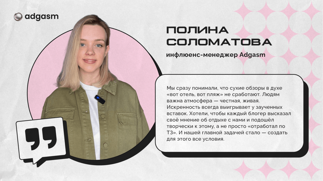 Пользователи скорее поверят человеку, который делится личными впечатлениями, чем рекламному объявлению. Они не склонны сразу бронировать поездки и изучают отзывы. Поэтому решили делать ставку на лидеров мнений: чтобы они лично проверили и порекомендовали отели, показали их преимущества и условия проживания.