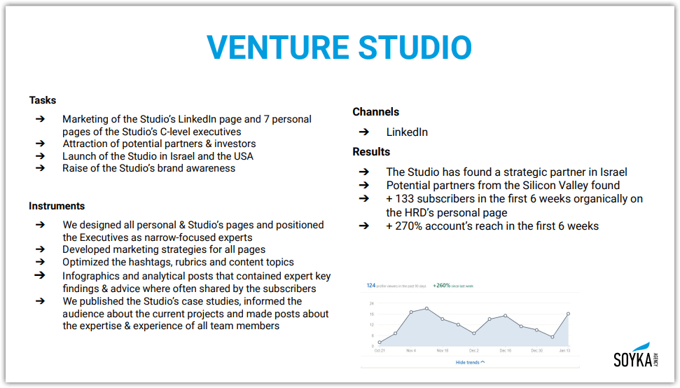 ➔ Мы публиковали кейсы студии, информировали аудиторию о текущих проектах и делали посты, информировали аудиторию о текущих проектах и делали посты об экспертизе и опыте всех членов команды.
