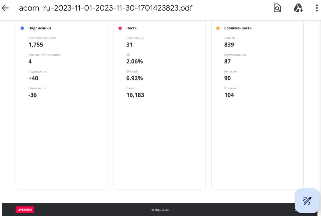 - контент-маркетинг: изначально были подобраны рубрики и типы контента, по которым был составлен подробный контент-план. Далее велась аналитика по вовлечённости и эффективности, на основе которой были отсеяны неработающие форматы. По итогу подобрали сбалансированную комбинацию из продающих, информационных и вовлекающего контента.- акции, в виде розыгрышей и конкурсов. В качестве призов предложили оффлайн подарки, сертификаты на услуги. Задействовали бота на основе #senler- рекламу настраивали не только таргетированную, но и в городских пабликах. Это позволило снизить стоимость подписчика и привлечь больше "живых" подписчиков.- для создания оригинальных фото и видео были прописаны рекомендации, примеры сценариев.- ежемесячно предоставлялся подробный отчёт в виде презентации, с использованием данных сервиса аналитики #livedune и внутренней статистики ВКонтакте.