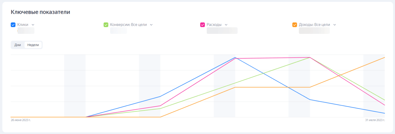 Совместно с клиентом решили протестировать первую гипотезу: пересоздать аккаунт Яндекса, так как была четкая тенденция на спад у нескольких подрядчиков и до нас, вне зависимости от качества настройки рекламных кампаний. И проблема могла крыться в рекламном кабинете.