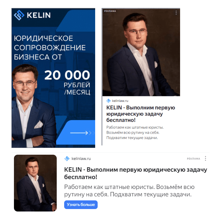 В тандеме с маркетологом клиента начали разрабатывать свое направление с визуальными концепциями для объявлений. Сначала тестировали портреты руководителя (персона в юридической сфере очень влияет) в цветах сайтах, но нужного результата такие креативы не принесли.