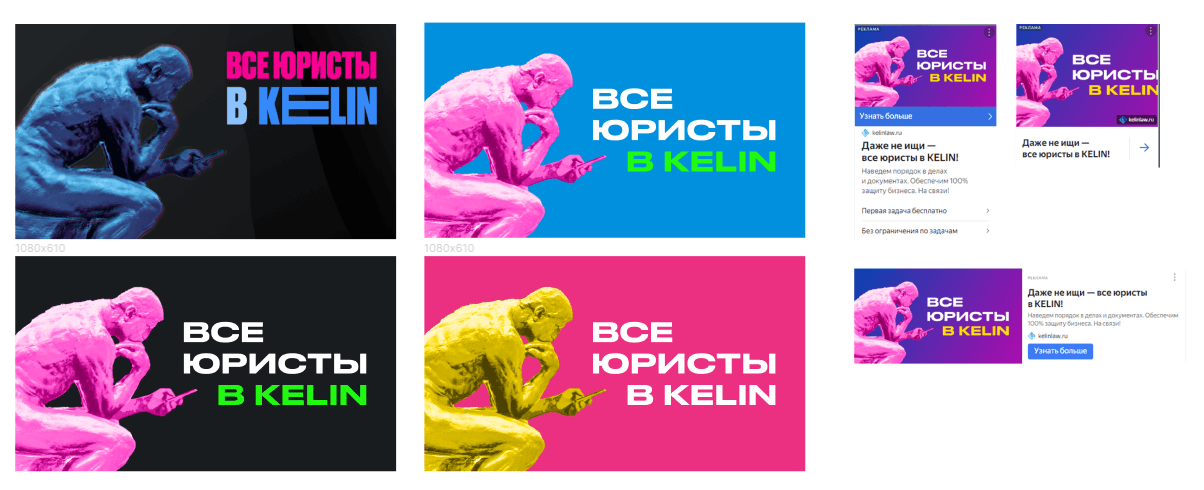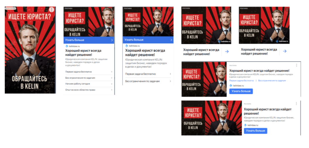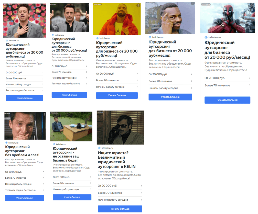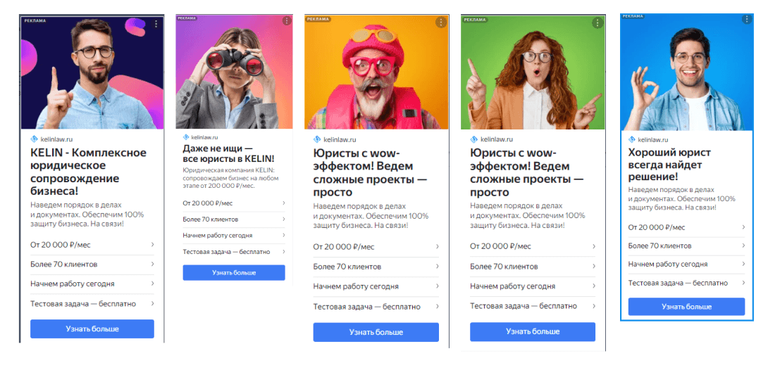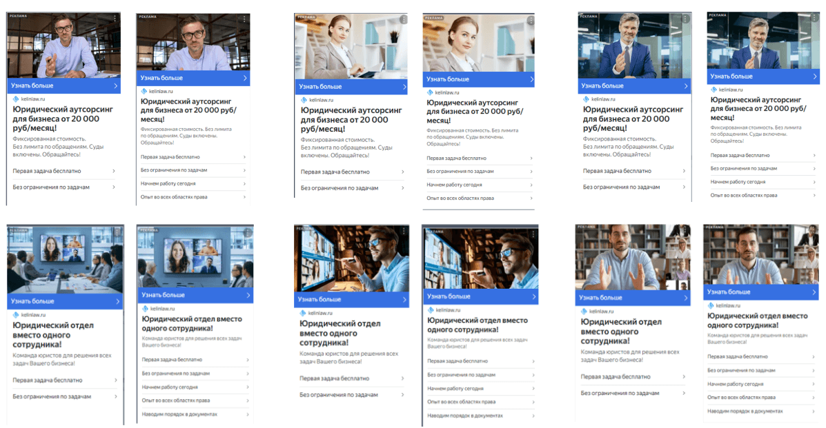 Перед запуском кампании на РСЯ совместно с маркетологом клиента проанализировали какие образы используются в юридической рекламе.