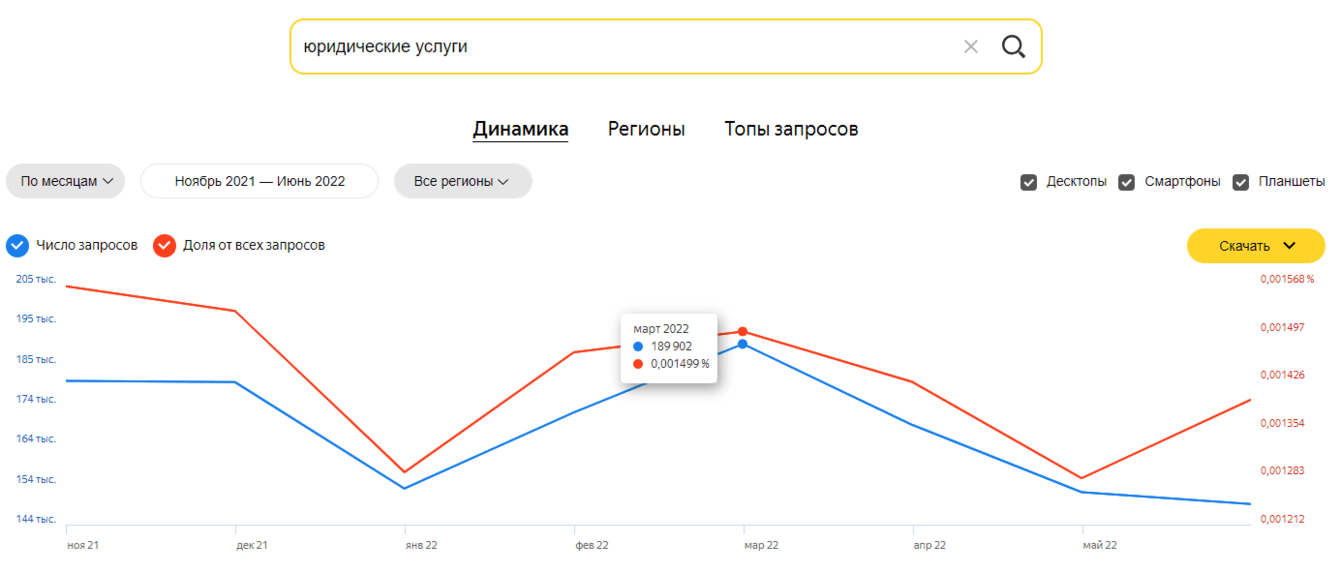 В целом, если забить в Wordstat любой запрос, связанный с юристами, то можно увидеть, что сезонности по интересу к услуге – нет. Кроме небольших всплесков с осени по весну. То есть, услугу ищут всегда, но пользуются ей в определенные моменты. Та же ситуация, например, если забить поисковые запросы “юрист” или “юридическая помощь”.
