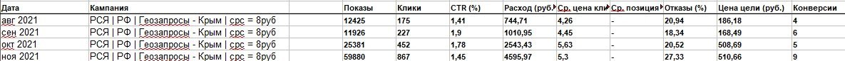 Для отработки аудитории которые находятся в любом другом городе Краснодара и Крыма: Делаем копии рекламных кампаний и оставляем запросы только с городом Краснодар, Симферополь, Севастополь и пр.
