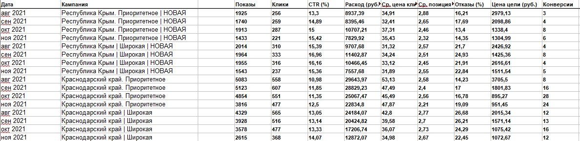 Для отработки аудитории находящихся в Краснодарском крае и республики Крым создаём кампании: собираем запросы, группируем кампании на приоритетные (что чаще заказывают оптом) и не приоритетные.