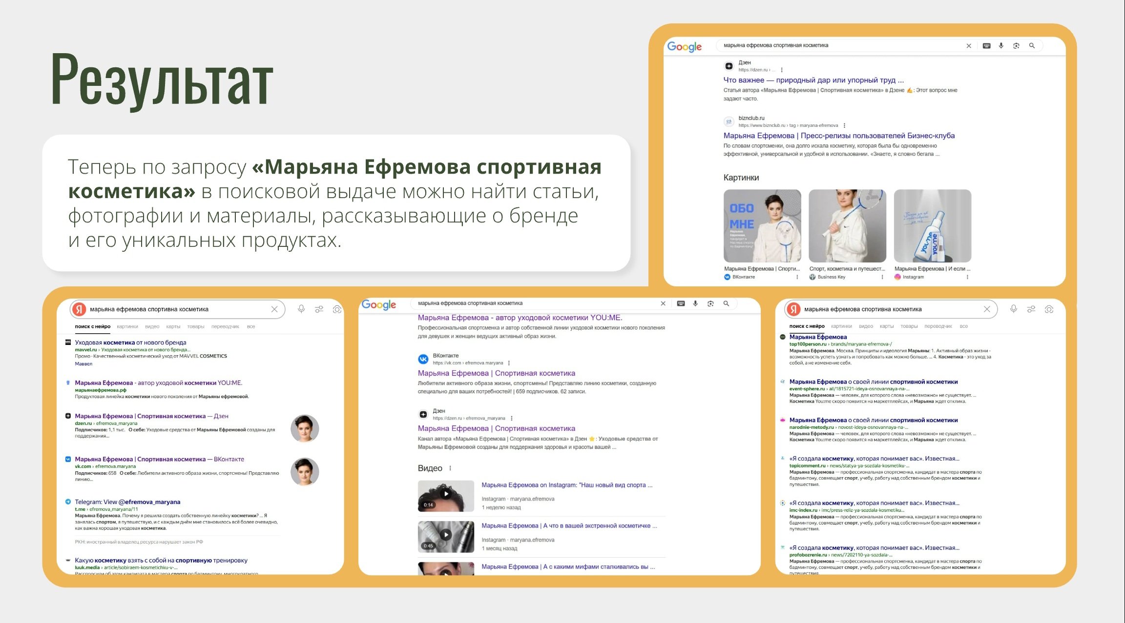 Упаковать и продвинуть личный бренд, транслирующий ценности спорта, красоты и осознанности. Разработать и вывести на рынок новый косметический бренд под собственным именем. Обеспечить информационную узнаваемость и присутствие в поиске, медиа и соцсетях. Создать полноценную digital-инфраструктуру: сайт, соцсети, Telegram-бот.