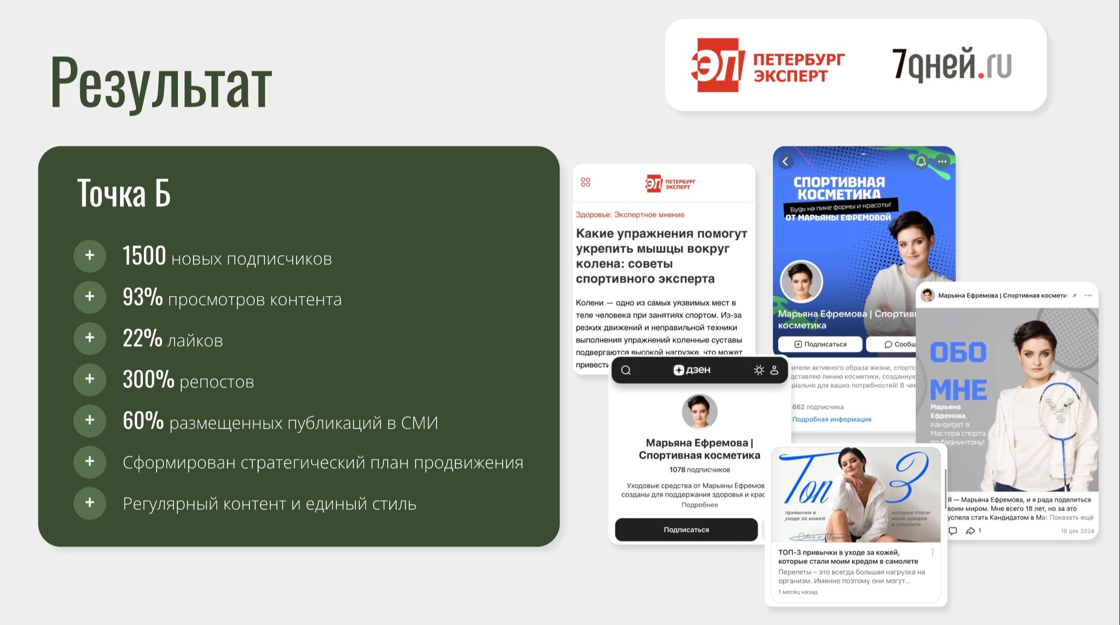 Подготовлены экспертные статьи и кейсовые интервью. Обеспечено размещение публикаций в профильных и популярных СМИ: 7дней.ru, Петербург Эксперт, ВКонтакте, Дзен и др. Проведен аудит присутствия в поиске и репутационного фона.