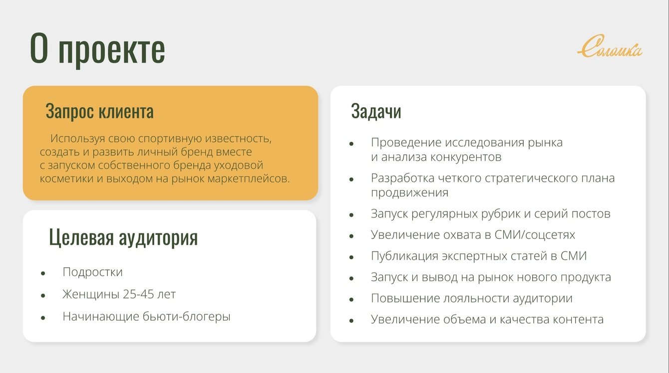 «Работа с командой PR-компании «Соломка» была настоящим удовольствием. Это профессионалы своего дела, которые не только понимают, как эффективно решать задачи, но и делают это с душой. Отдельно хочу отметить атмосферу в команде — здесь царит взаимопонимание и дружелюбие. Спасибо за качественную работу и отличное сотрудничество!