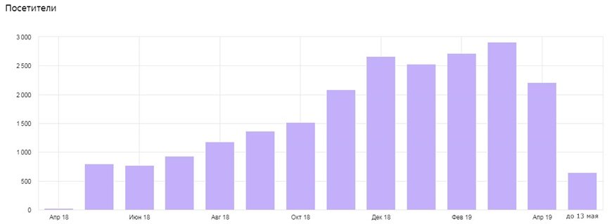 На графике мы видим, что уже в первый месяц было 802 уникальных посетителей. В марте эта цифра достигла отметки 2 732 человека.