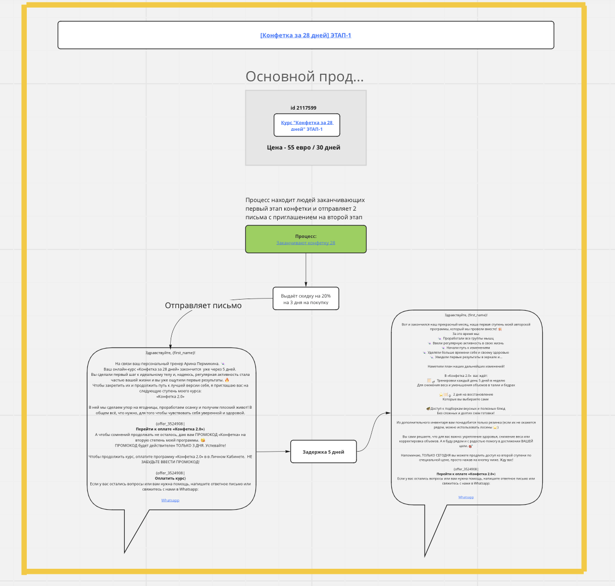 3) Прогревающие воронки и точки касания с клиентом для перехода из продукта в продукт. Была реализована система рассылок, которая оповещала клиента за 3-5 дней до окончания курса, в день окончания курса, а также через 3 дня после окончания продукта. В письмах были кратко описаны преимущества следующей ступени, а также специальные предложения по приобретению продукта.