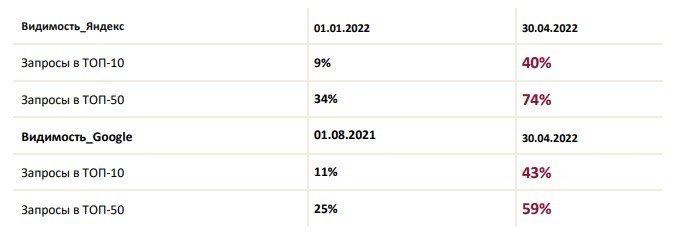 Таблица ниже отражает в сравнении изменение процента видимости сайта в поиске по