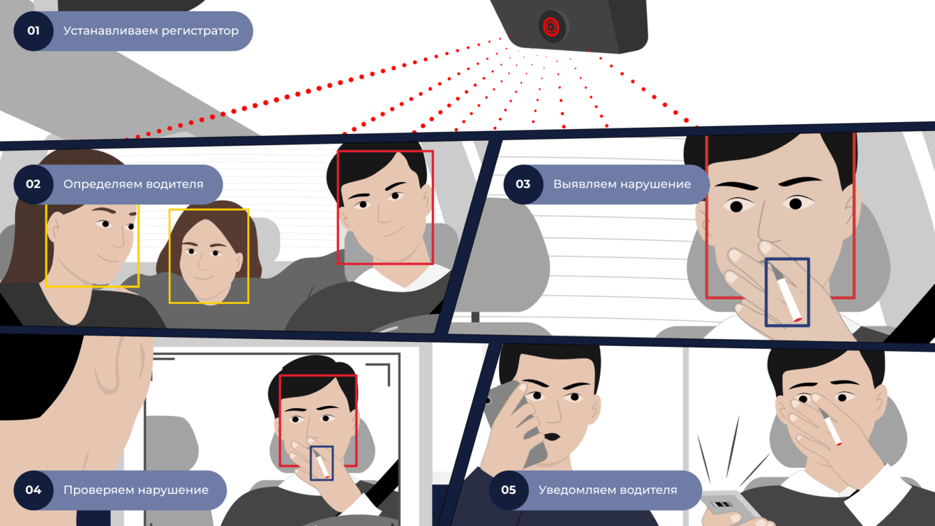 С помощью компьютерного зрения (не требует никаких дополнительных датчиков, кроме камеры) детектируется курение в салоне.