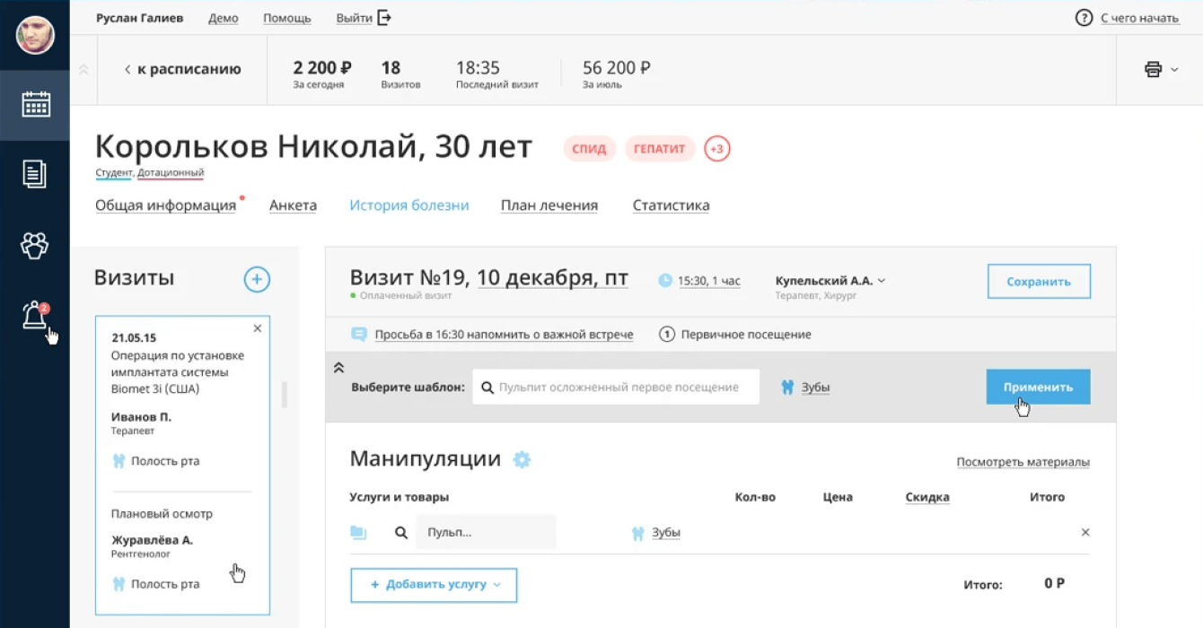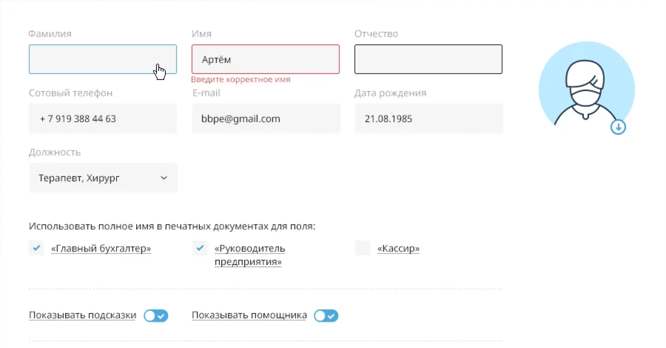 Все данные о состоянии пациента и проведенных/назначенных манипуляциях врач вносит в карточку, которую заполняет во время или после приема.
