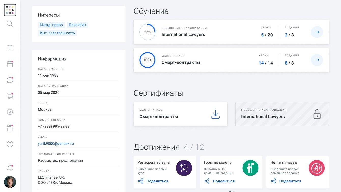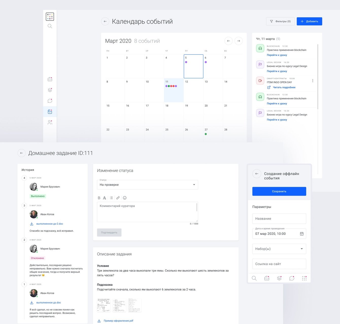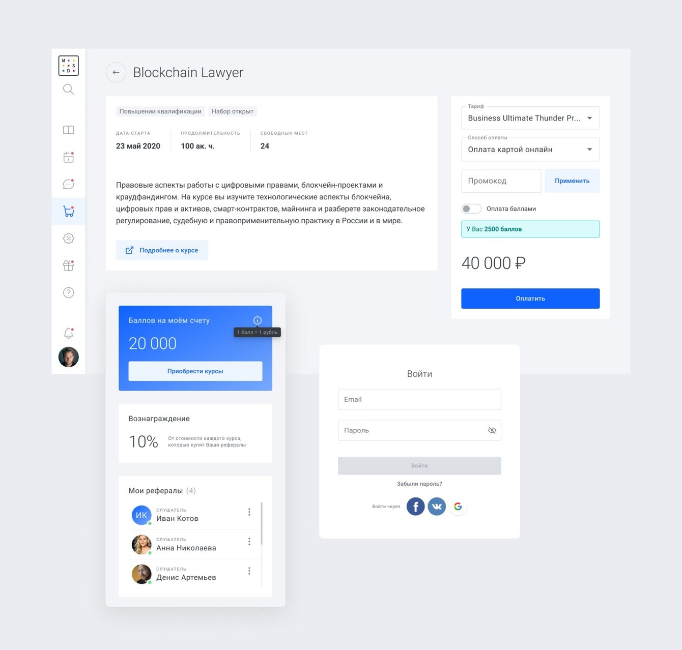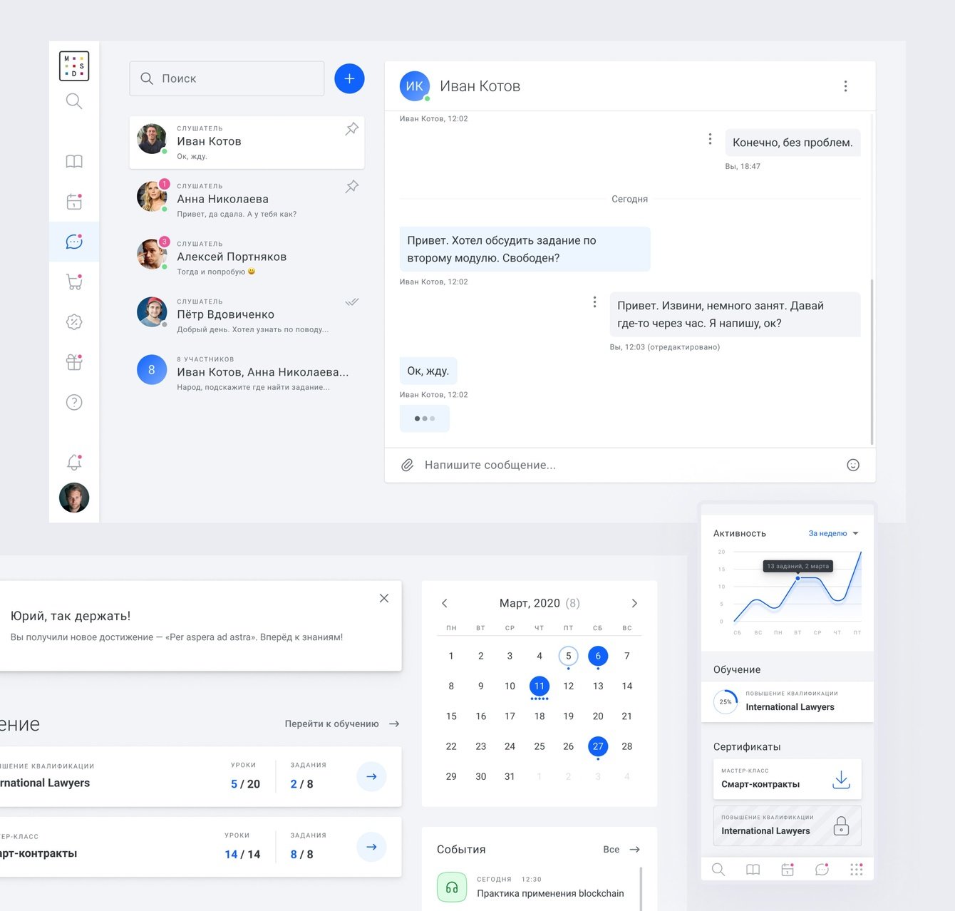 Сделали онлайн-школу для юристов. Есть витрина курсов с онлайн-оплатой, учебные группы, конструктор уроков, календарь, чаты, прогрессы.