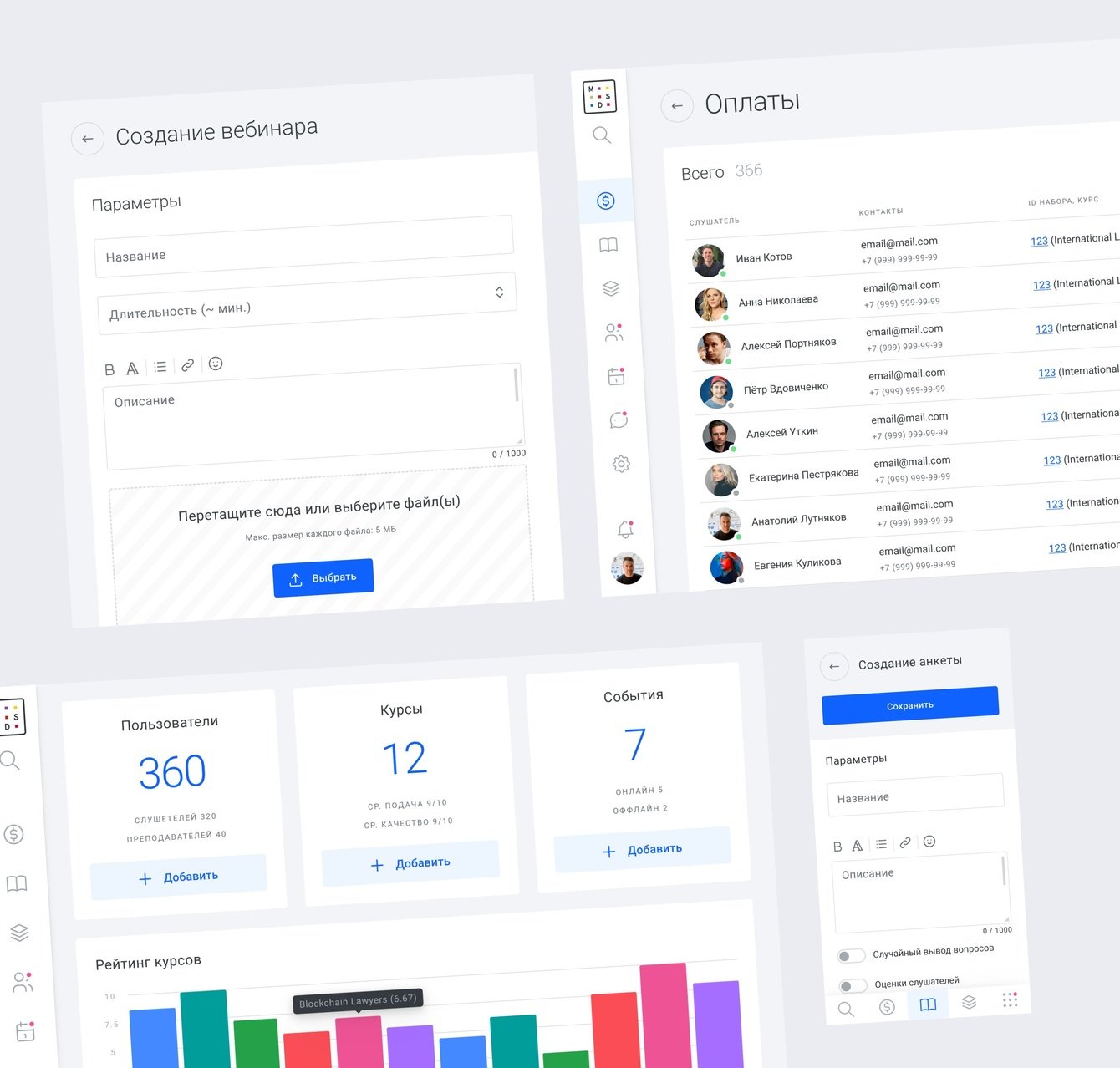 Администраторы управляют пользователями, курсами, учебными группами, имеют доступ к системным настройкам. Интерфейс адаптивный, в мобильной версии тот же функционал.