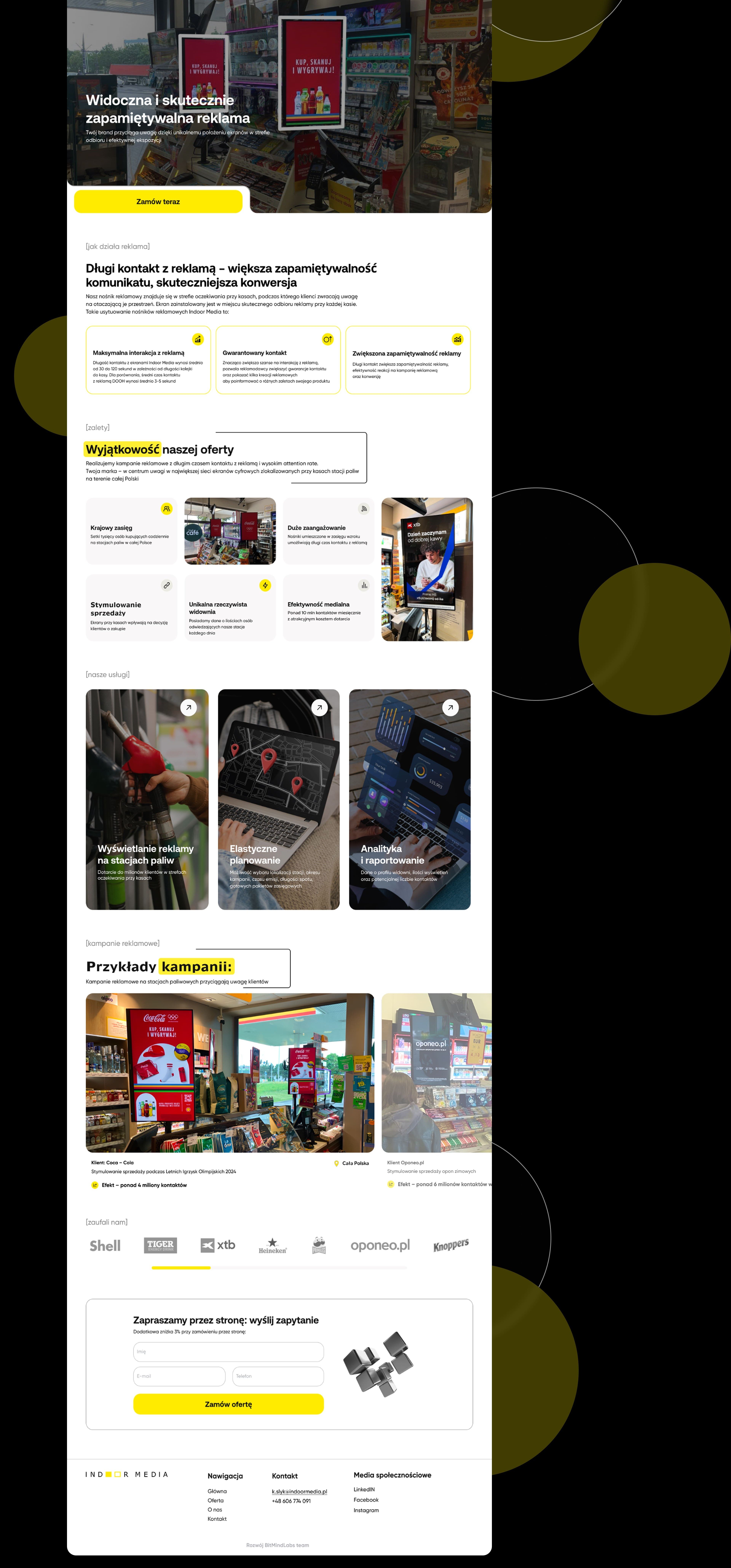 На внутренних экранах сайта мы показали масштаб и охват сети: интерактивная карта с расположением экранов по всей Польше, реальные примеры размещений и аналитика по целевой аудитории. Статистика и графики делают данные наглядными, а блоки с рекламными возможностями помогают пользователям быстро выбрать подходящий формат размещения.