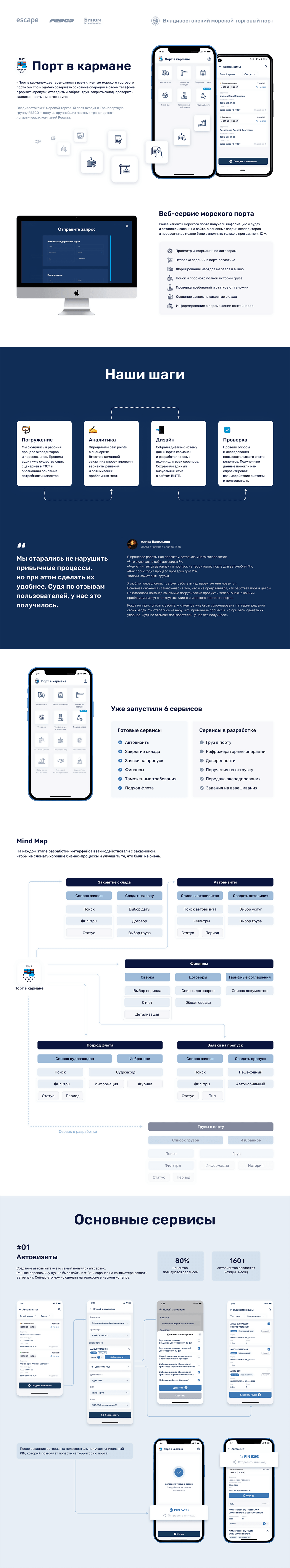 Перед нами стояла задача совместно с группой разработки заказчика спроектировать сервисы, позволяющие клиентам морского порта решать основные задачи по работе с портом со своего мобильного телефона.