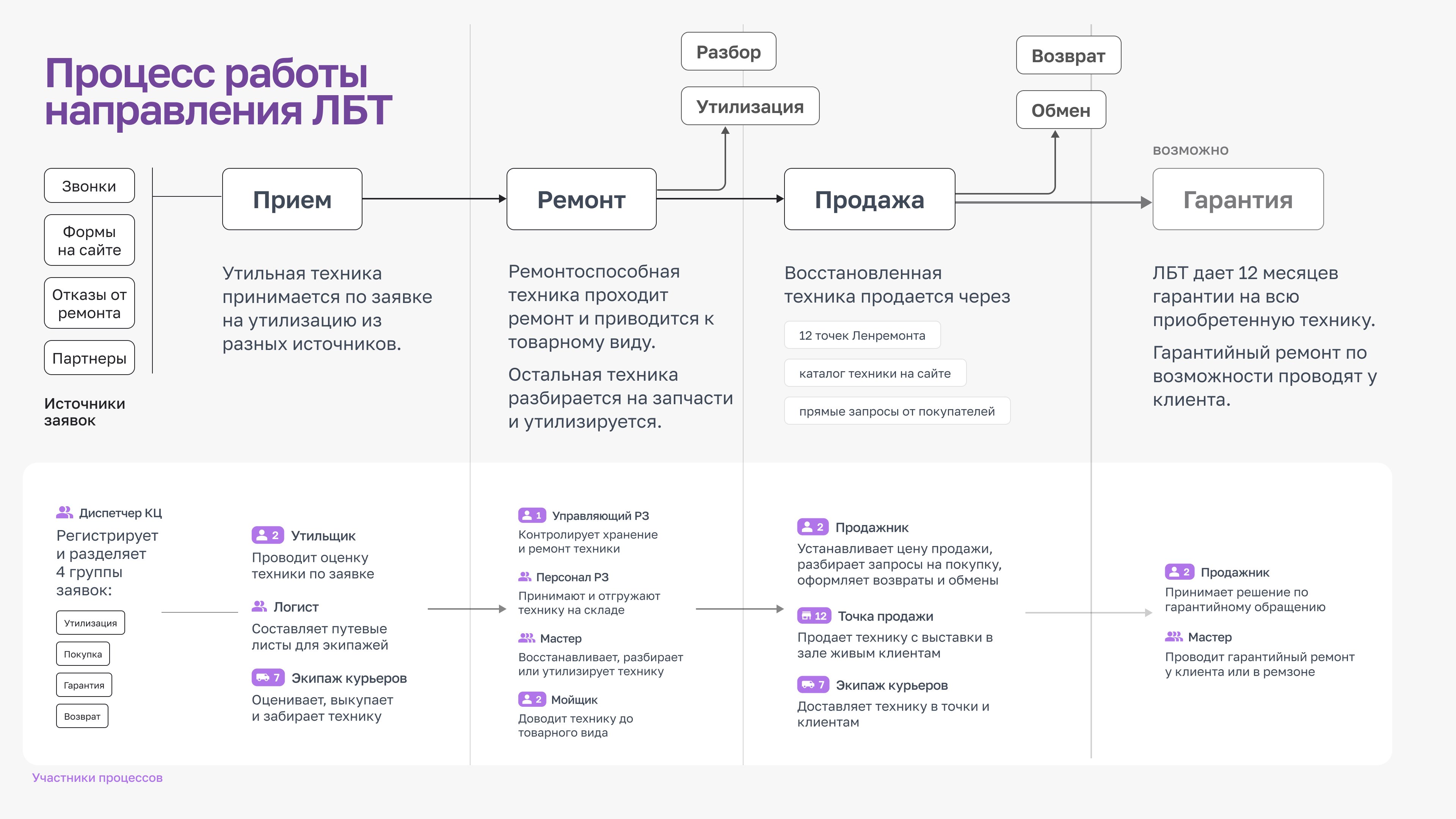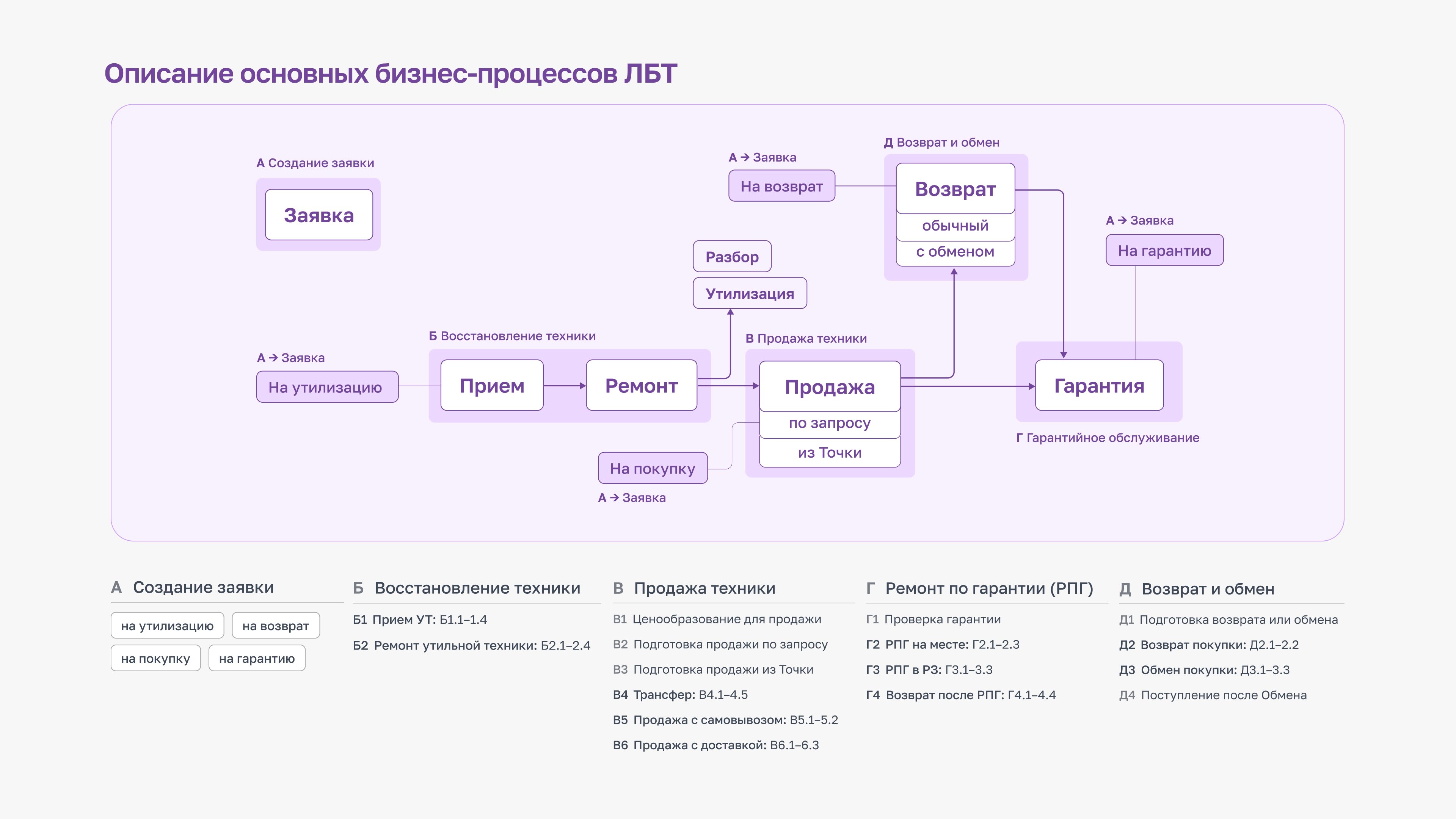 Центральная точка входа в процесс: здесь фиксируются обращения клиентов – на утилизацию, покупку, возврат или гарантийный случай. От типа заявки зависит дальнейший путь техники и активируются соответствующие сценарии.